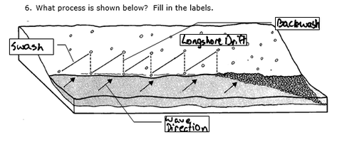 | Longshore Drift | The transportation of sediments along a beach due to the zigzag motion of waves and backwash |