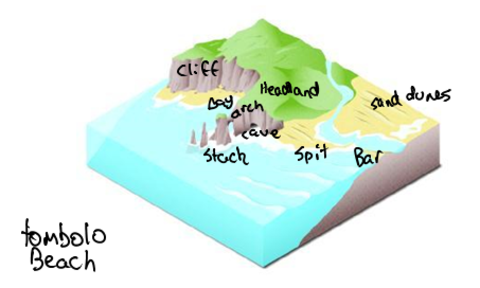 | Tombolo | When a spit connects a stack or small island to the coastline it becomes a tombolo. |
