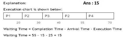 | 3. An operating system uses Shortest Remaining Time first (SRT) process scheduling algorithm. Consider the arrival times and execution times for the following processes: ----------------------------------------------------------- Process| Execution time| Arrival time ----------------------------------------------------------- P1 | 20 | 0 P2 | 25 | 15 P3 | 10 | 30 P4 | 15 | 45 ----------------------------------------------------------- What is the total waiting time for process P2? | |