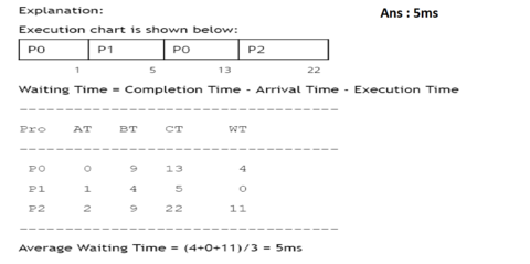 | 4. Consider the following table of arrival time and burst time for three processes P0, P1 and P2. ----------------------------------------------------------- Process | Arrival time | Burst Time ----------------------------------------------------------- P0 | 0 ms | 9 ms P1 | 1 ms | 4 ms P2 | 2 ms | 9 ms ----------------------------------------------------------- The pre-emptive shortest job first scheduling algorithm is used. Scheduling is carried out only at arrival or completion of processes. What is the average waiting time for the three processes? | |
