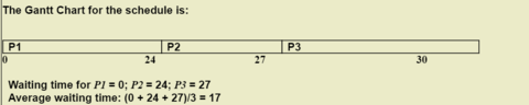 | 5. First-Come, First-Served (FCFS) Scheduling ----------------------------------------------------------- Process | Burst Time ----------------------------------------------------------- P1 | 24 P2 | 3 P3 | 3 ----------------------------------------------------------- Suppose that the processes arrive in the order: P1 , P2 , P3 Calculate average waiting time. | |