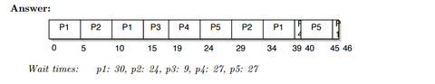 | 8. Say we have the process arrival time chart given below. ----------------------------------------------------------- Process| Arrival time| Burst Time ----------------------------------------------------------- P1 | 0 |16 P2 | 0 |10 P3 | 6 | 4 P4 | 7 | 6 P5 | 8 |10 ----------------------------------------------------------- Draw a Gantt chart to illustrate how these processes would be scheduled using Round Robin (RR).Assume that the quantum is set to 5 time units. |