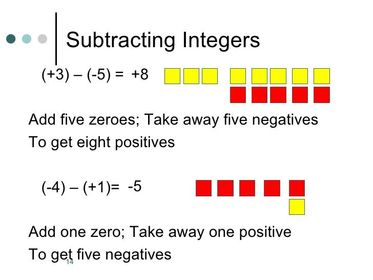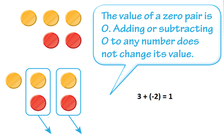 | Addition using Chip Model | 1. Use two different chips (e.g. red and blue) to represent positive and negative values. 2. Selecting the right number of red (negative) or yellow chips (positive) 3. The add the right number of red and yellow chips for the addend 4. Pair up red and yellow chips (zero pairs) and remove 5 Count the remaining red or yellow chips (only 1 type of chip should be left) |