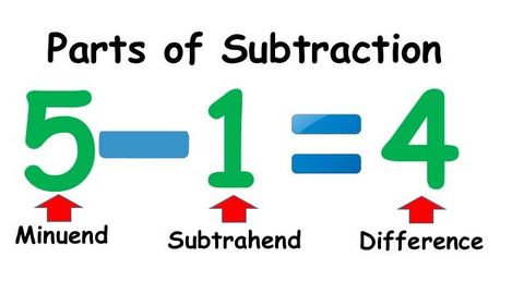 | Parts of Subtraction | The first term in subtraction is minuend (5) and the second term is called subtrahend (1). The result of subtraction is called the difference (4). You can think of the difference as the distance between the minuend and subtrahend. \(5-1=4\) |