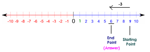 | Using a Number Line to Do Integer Subtraction | 1) Find the minuend (starting value). 2) For a positive subtrahend move left and for a negative subtrahend move right 3) Label your finishing value. \(9-3=6\) |