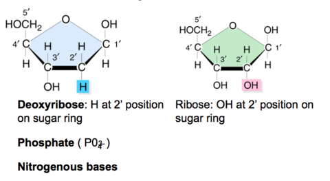 | What is the key structure difference between deoxyribose and ribose | In DNA H' is at the 2' position In RNA OH' is at the 2' position |