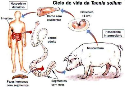 | REPRODUÇÃO DA TÊNIA | As tênias mais comuns são achatadas e longas, parecidas com uma fita, e chegam a atingir cerca de 8 metros de comprimento. Dois tipos de tênias costumam parasitar o homem: a Taenia solium e a Taenia saginata. |