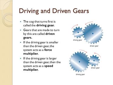 | What is a driving gear and a driven gear? and what combinations of gears increase force and speed? | The gear that supplies the force is called the driving gear. The gear that is connected to this gear is called the driven gear. Different combinations of gears are selected to increase either the force applied or the speed of turning. |
