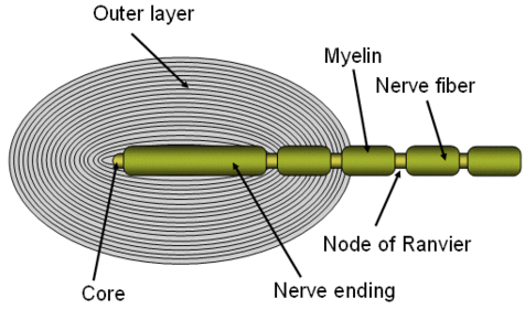 | How does an action potential travel along a myelinated axon? | Myelin sheath acts as an electrical insulator preventing action potentials from forming. Each schwan cell has a localised current - action potentials can only occur at nodes of Ranvier, thus action potentials travel by jumping between adjacent nodes in a process called SALTATORY CONDUCTION |