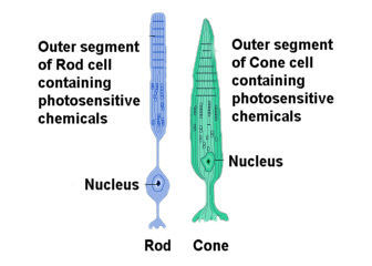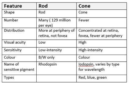 | What effect do the structural differences of rod & cone cells have on function? | - Rod cells are attached in threes to each bipolar neurone, giving them a sensitivity to lower light as generator potentials are summative, thus are more likely to exceed the threshold to cause an impulse. This gives lower visual acuity however, as only one impulse is transmitted to the brain per three, rather than individually. - Three different variants of pigment in cone cells gives sensitivity to three different ranges of visible light wavelength, allowing colour vision |
