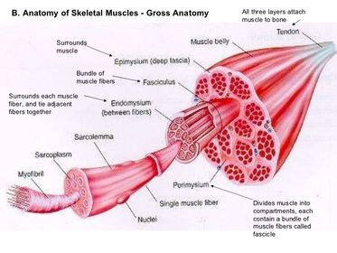 | What are the subdivisions of a skeletal muscle? | - Whole muscle - Bundle of muscle fibres - Muscle fibre - Microfibrils |