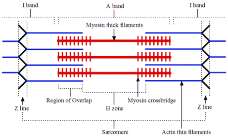 | What is the banding structure of a microfibril like? | Z line separating each sarcomere - I band consisting of actin filaments - A band consisting of myosin filaments and overlap with actin filaments - H zone consisting of A band not including the overlap |
