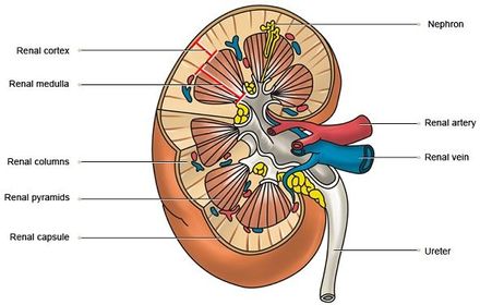 | What the structure of the kidney like? | - Fibrous capsule - membrane surrounding the kidney - Cortex - lighter region made up of Bowman's capsules, convoluted tubules and blood vessels - Medulla - darker region made up of loops of Henle, collecting ducts and blood vessels - Renal pelvis - funnel shaped cavity that collects urine into the ureter - Ureter - tube that carries urine to the bladder - Renal artery - supplies the kidney with blood - Renal vein - returns blood to the heart |