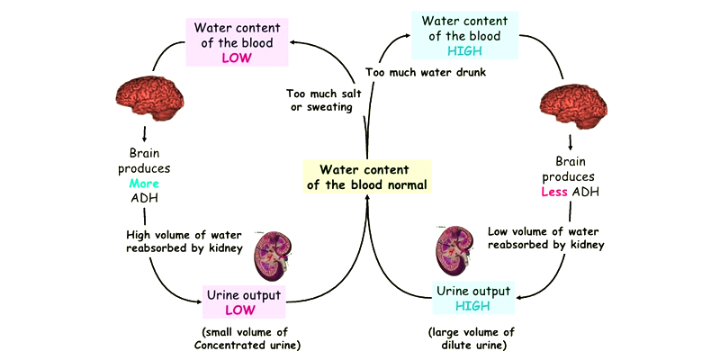 | How does ADH affect the concentration of urine? | - increased ADH makes urine more concentrated by causing more water to be absorbed |