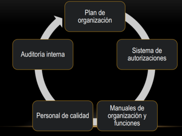 | Control interno: componentes | Sistema interior de una compañía que está compuesto por: Plan de organización. Asignación de deberes y responsabilidades. Diseño de cuentas e informes. Otras medidas empleadas. |