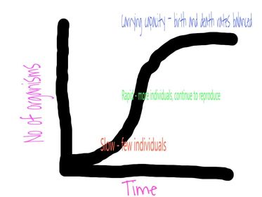 | This is the population growth curve. The first part of the graph is a shallow curve showing that there is slow growth of the population size because there are few individuals present. Then the second part is the rapid growth, there are more individuals and they continue to reproduce. The last part of the graph is the part where it plateau, this is when carrying capacity has been reached, this will fluctuate but will remain relatively constant. | |