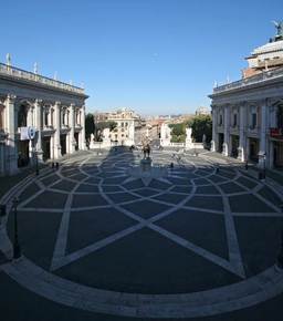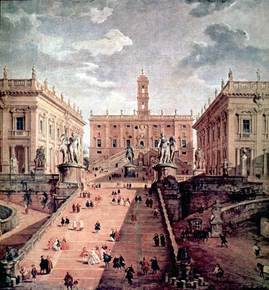 Campidoglio. (Rome, Italy) Michelangelo. plaza oriented towards west + St. Peter's. east end of Senate building. Palace of the Conservators facade. |