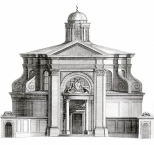 S. Andrea al Quirinale. Gianlorenzo Bernini. Note: "wings" of facade, layering of elements. Classical vocabulary. geometry + plasticity typical of Baroque. |