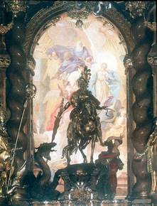 Benedictine Abbey. (Weltenburg, Germany) Cosmas D. Asam + Egid Q. Asam. St. George statue backlit by light from chapel. Bernini multimedia works influence. |
