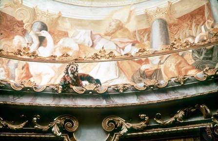 Benedictine Abbey. (Weltenburg, Germany) Cosmos D. Asam + Egid Q. Asam. Illusionistic painting of ceiling. use of hidden light sources. rich decoration. Bernini influence. lighter, playful feeling. |