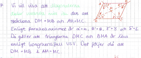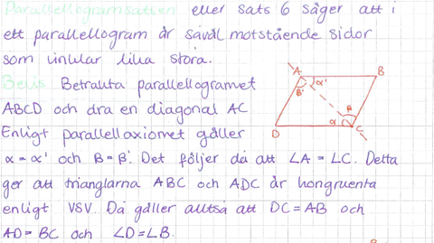 | visa att diagonalerna i ett parallelogram delar varandra mitt itu | |