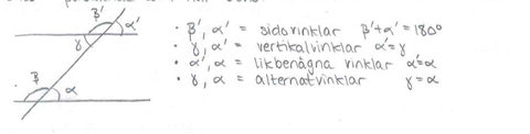 | rita en bild med sidovinkel, vertikalvinklar, likbenägna vinklar och alternatvinklar | |