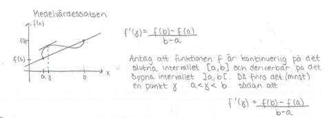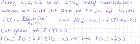 | bevisa mha medelvärdessatsen att om en funktion på ett intervall I har en positiv derivata så är funktionen strängt växande | |