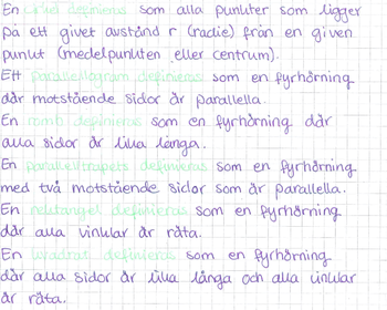 | Definiera: cirkel, parallelogram rom paralleltrapets, rektangel kvadrat | |
