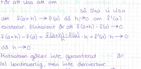 | visa att f(X) är deriverbar i a så är f(X) kontinuterlig i a | |