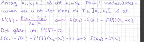 | bevisa mha medelvärdessatsen att om en funktion på ett intervall I har en derivata som är noll så är funktionen konstant. | |