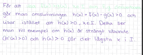 | visa att f(X) > g(X) x tillhör intervallet I och f och g är deriverbara. | |