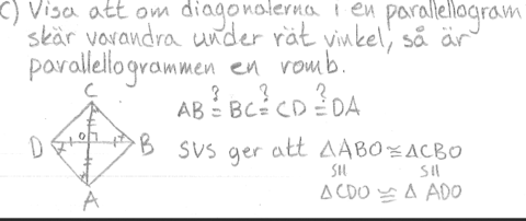 | visa att om diagonalerna i en parallelogram skär varandra under rät vinkel, så är parallelogrammen en romb. | |