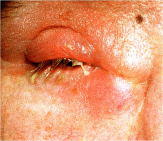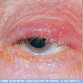 | Hordeolum | Sty - painful, tender infection around hair follicle lid margin |