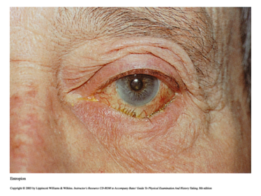 | Entropion | Lid droops inward, lower lash may irritate conj and cornea |