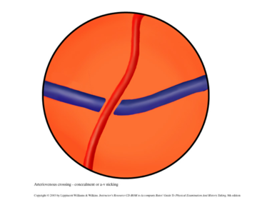 | A-V nicking | vein abruptly stops on either side of the artery |