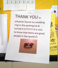 | A woman writes a "Thank You Note" to the person who found her wedding ring. | |