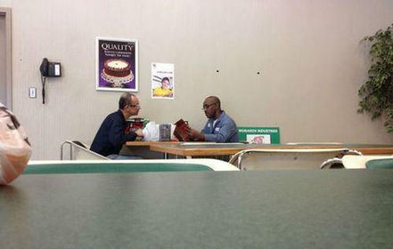 | This man reads every day at lunch to another man who can't read. | |