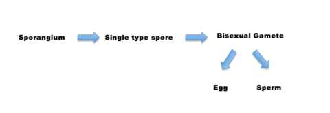 | Heterosporous | Megasporangium -> Megaspore -> Female Gametophyte -> Egg Microsporangium -> Microspore -> Male Gametophyte -> Sperm |