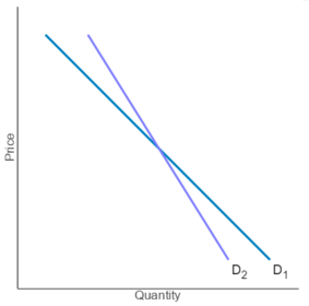Consider the two demand curves illustrated in the figure to the right. Which of the two is relatively more elastic? D1 is more elastic. While elasticity is not the same as​ slope, it is true that if two demand curves​ intersect, the one with the smaller slope​ (in absolute ​value)—the flatter demand curve—is more elastic.​ Therefore, Upper D 1 is more elastic than Upper D 2 because it is flatter.