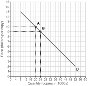 Consider the market for a new​ CD, where the price is initially ​$10.00 and 20 thousand copies are​ sold, as indicated in the figure to the right at point A. The music company is considering lowering the price to ​$9.00​, at which price 24 thousand copies would be sold. What is total revenue at the initial price​ (at point​ A)? What would total revenue be at the lower price​ (at point​ B)? Given this change in total​ revenue, is demand between these prices elastic or​ inelastic? Revenue is initially ​$200 thousand. ($10.00 multiplied by 20 thousand units) Revenue would be ​$216 thousand. ($9.00 multiplied by 24 thousand units) Demand​ (in this range of​ prices) is elastic. A decrease in price increases total​ revenue, so demand is elastic.