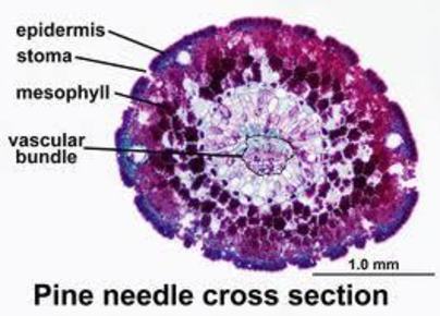 | this is a cross section of a pine needle or a pinus leaf. you can see the stomat that are belowt he surface to keep water in and the cuticle, here labled as the epidermis. in the middle of the cross section there are larger and smaller circles. These are the vascular bundles of xylem and phloem cells | |