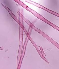 | this is a pine wood maceration. the cell walls of the xylem are strangthened by lignin and are mostly tracheid xylem. You can see that the walls of the sample are thicker in some placesand thinner in others. these are called pits and they are so the water can flow through the pits and then the ends of the tracheids | |