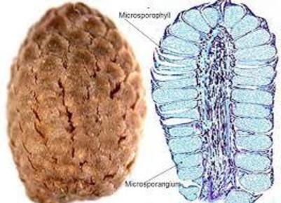 | this is a staminate cone. the diploid cone is made of small reproductive sites called microsprophylls which contain microsporangia.these microsporangia make microspropcytes which hare the microspore mother cell. these microsporocytes divide through meiosis into 4 haploid microspores inside the microsporangia and then divide through mitosis into a microgametophyte AKA a pollen grain. the pollen grains will be released from the cone an dispersed by wind through pollination. | |