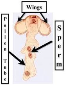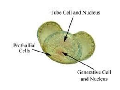 | this is a microgametophyte or a pollen grain. it consists of two air bladders on the dies a tube cell at bottom center and a generative cell top center | |