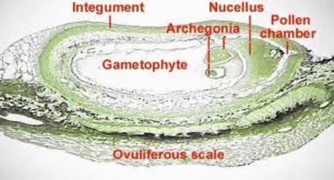 | this is a pine ovule with mature archegonium. the megasporocyte will divide by meiosis to produce 4 haploid megaspores, only one of which will survive and be fertilized. this surviving megaspores will will divide through mitosis into a megagametophyte withing the megasporangium. these megagametophytes can have two or three archegonia which contain a single egg cell. | |