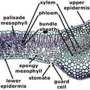 | this is a lilac or syringia leaf. photosynthesis occurs in the palisade layer. the leaf is coverd not just by the epidermis but also a waxy cuticle, both helping to conserve water. the xylem tissue moves water up the stalk of the plant and into the leaves. | |