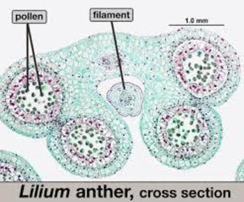 | this is a lilac anther. the anther is mounted on top of a thin stalk called a filament. the anther section contain 4 pollen sacs which are the diploid microsporangia. when a microspore develops into a pollen grain it will contain 2 nuclei. the structure of the pollen cell is similar to that of gymnosperms and will undergo mitosis to make the sperm nuclei. | |