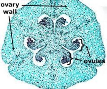 | this is a lilac ovary. the ovary is found at the bottom of the carpal, below the style and the stigma, the later where the sperm enters the megasporangia. the egg sac or gametophyte is found at the tip of the swirl looking structures. these swirls are the integuments accessed through the micropyls. | |