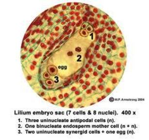 | this is an embro sac. the 8 nuclei that have been produced are seen here. three of the 8 are found at the micropylar end or where the opening is, one finctioning as the egg the other two as synergid nuclei. three more are found at the opposite end and function as the antipodal nuclei. two nuclei stay in the centre as polar nuclei. the integuments will becomethe seed coat and surround the embryo sac leaving an opening at the micropyle. | |