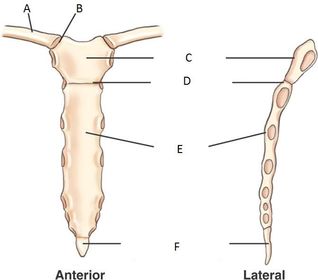 | A. clavicle B. sternoclavicular joint C. manubrium D. sternal angle E. body F. xiphoid process | |